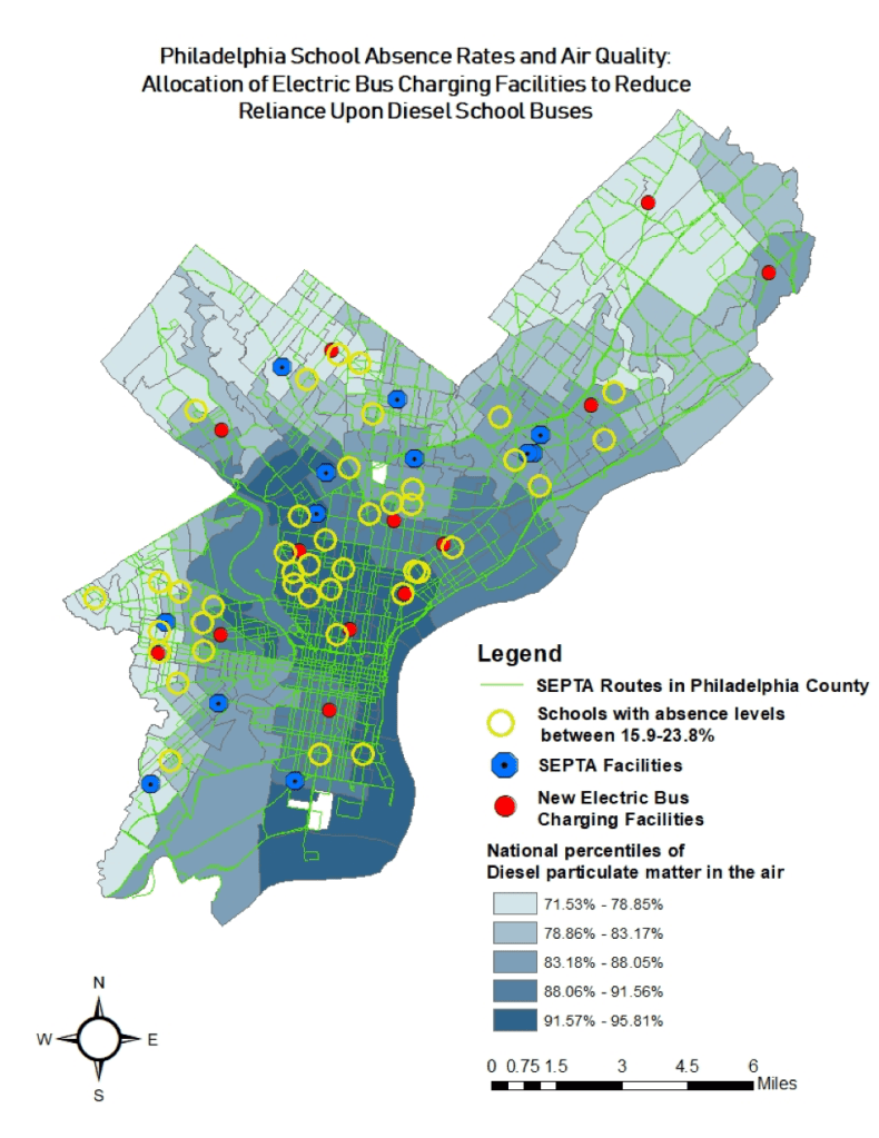 The new locations were mostly located within the north/northeast Philadelphia area, in areas with schools that have higher absence rates. Of the three environmental factors, it appears that the schools with high absence rates are located primarily in areas that are also in the highest percentile of diesel particulate matter. Of the various factors, it appears that children living in poverty, diesel particulate matter, and respiratory hazards all coincide in the same area of North Philadelphia. This would be a fitting area to begin the move from diesel to electric, for both public transit as well as school buses.