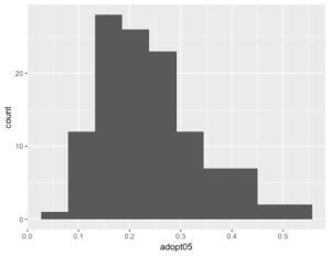 After analyzing the regression model of “adopt05” by “medage” in a spatial autoregression model, I would infer because there is statistically significant spatial clustering of our dependent value and significant influence of the independent measure upon the dependent measure in our model, that we would be very likely to find that in the general population across these areas. However, it does not seem to explain as large of a portion of the variability, or exert as strong of an influence as I thought it might from the original regression model. I would like to explore other variables such as other levels of physical infrastructure in a spatial model, such as the percent of paved roads, or perhaps the infrastructure of municipal utilities offered. I would also like to add the variable of race and ethnicity, to see if there is an inequality of services offered by race.