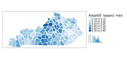 In order to test spatial autocorrelation, we first need to create a network to define who the spatial neighbors are for this comparison. In this analysis, we are defining neighbor’s using the rook’s case, or those which share a boundary, but not a corner. After we define who the neighbors are, we can create a spatial weights matrix, which determines the weight of influence those neighbors have based on the total number of numbers. Once the spatial weights matrix is created by assigning a 1 to each neighbor, a 0 to each non-neighbor, and then dividing the 1 by the number of neighbors, the lagged means can be calculated. These are calculated by multiplying the observed value of each neighbor by that neighbor’s weighted value. Each county then has a lagged mean of its neighbors. That can be compared to the value of the county itself, to see what the relationship is. In this way, first we will test for spatial dependency in the dependent variable, “adopt05”. Then we will use the models of lagged means and the spatial error to test the regression model of “adopt05” by “medage”. Where the Moran’s I can give an indication of clustering or not, it cannot provide the diagnostic of significance. The Monte Carlo test will compare the Moran’s I output to that of complete spatial randomness, 10,000 times, in order to see what the probability is that we would see the value of Moran’s I that we see if the values are random. We can use the Local Moran’s I to understand the clustering of particular high or low values.